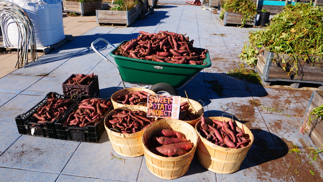 Eastdale Collegiate Institute has a large rooftop garden maintained by us and supports a diverse group of students, including many neurodiverse learners who really enjoy our garden programming. Gardening gives students a hands-on space where they can learn, explore, and feel proud of their work. We are excited to continue working at Eastdale CI and spending more time in the garden together. In June 2025 students planted sweet potato slips in the rooftop beds and in October they harvested over 180 kilograms of sweet potatoes!